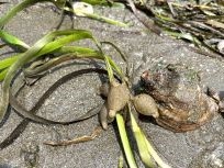 <アマモにコウイカの卵が付いていました。アマモ場は生き物の棲みかとして大きな役割を担っています。>