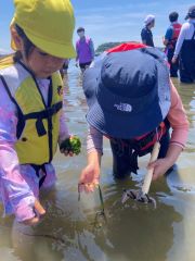 <曳き網により様々な生物を見つけました。観察会の様子です。> <気持ちの良い晴天の中、泳ぐ姿も。微笑ましいです。>