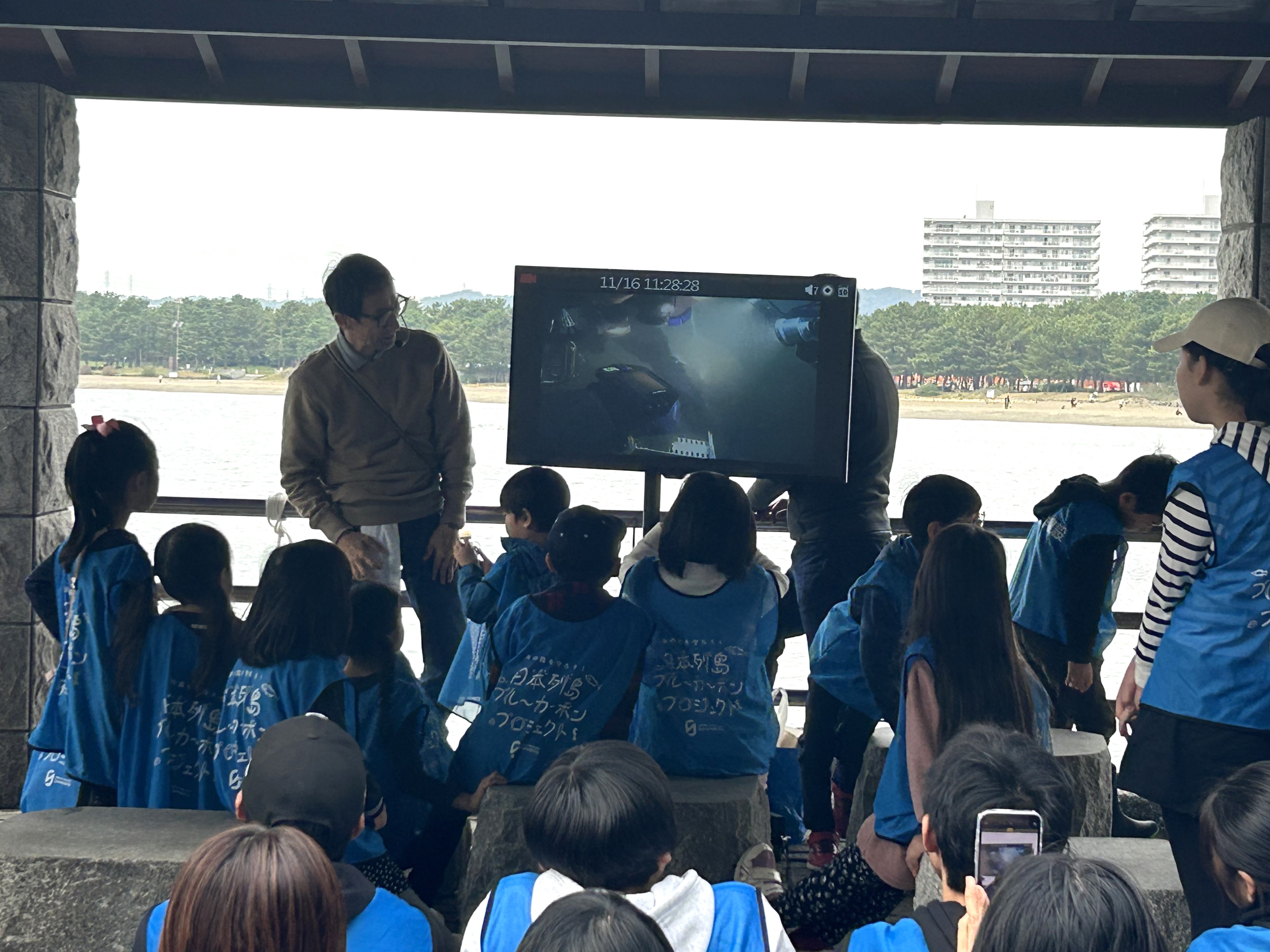 <タイバーさんが海中で播種を行っている様子をモニターを見ながら見守ります。>