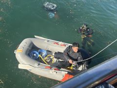 <陸上からゴムボートへ種の入ったバケツを下ろし、ダイバーさんが海中へ潜り一つずつ埋めていきます。>