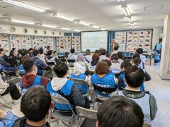 <海辺つくり研究会の木村さんより作業に先立ち、環境に関するお話がありました。> <みなさん熱心に「東京湾アマモ場再生活動」についてのお話に耳を傾けています。> <アマモのタネを入れる不織布の袋に、子どもたちが思いを込めて絵を描いてくれました。> <アマモのタネをピンセットを使って入れていきます。> <タネを入れた袋に現地で採取した砂と泥を入れたら完成です。> <とても良い天候の中、たくさんの参加者に見守られながら、ダイバーさんが播種を行いました。>