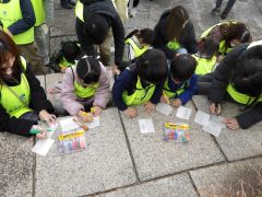 <始めに海辺つくり研究会さんのお話を聴きました。> <水中の生き物をみんなで観察しました。> <子どもたちはタネを入れる前に、生分解性の不織布の袋に絵を描きました。> <アマモのタネです。> <タネを入れた袋に砂と泥をまぜたものを入れていきます。> <海中に袋を埋めるダイバーさんを見守ります。>